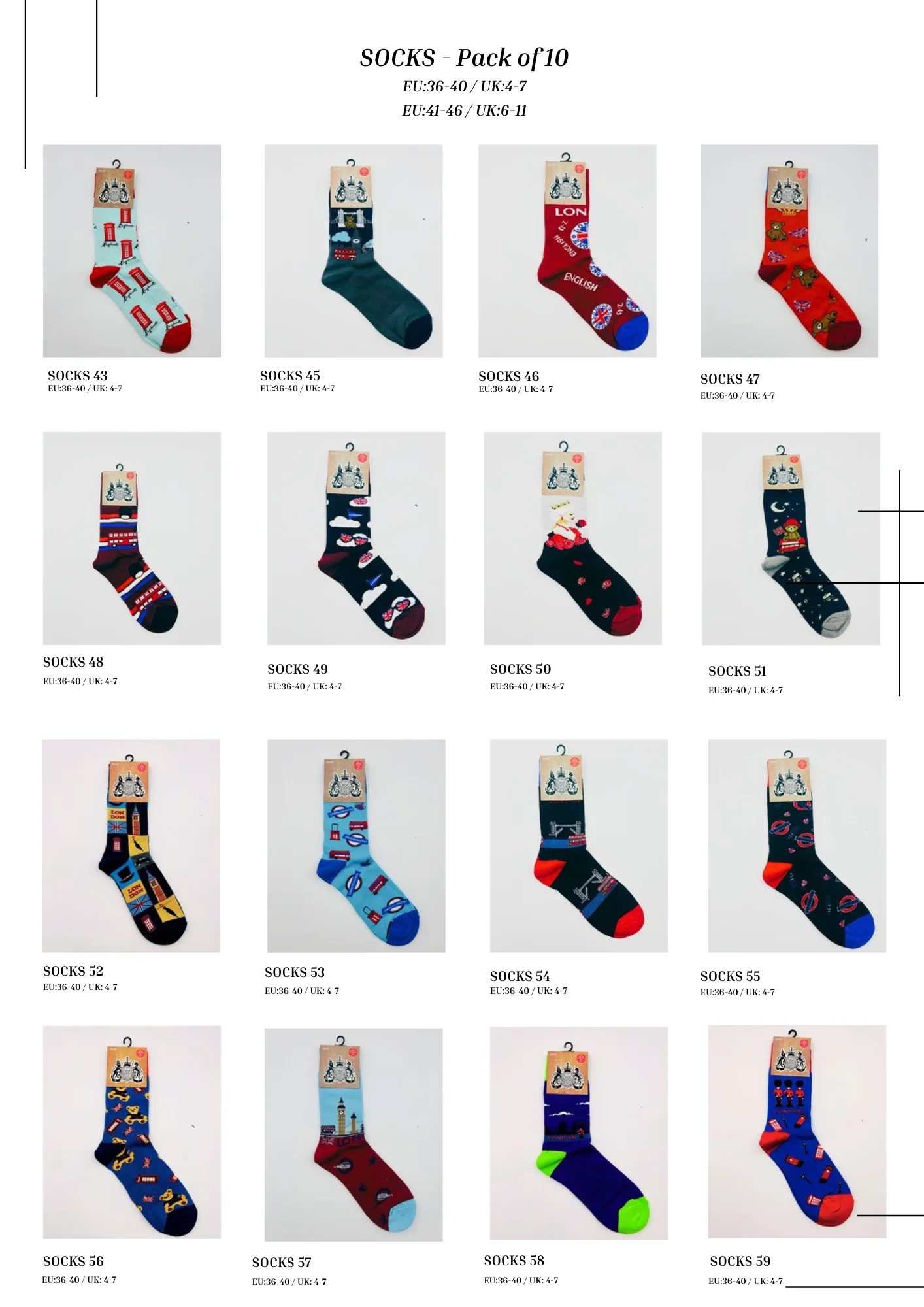 A colourful selection of London-themed souvenir socks featuring iconic graphics such as red buses, telephone boxes, Union Jack elements, guards, landmarks, and playful UK motifs. Designed for everyday comfort, these socks are perfect for souvenir shops, gift stores, and tourist retailers.