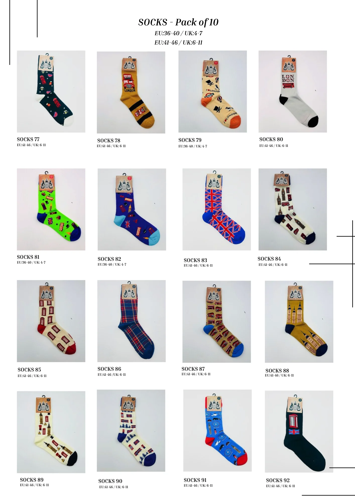 This London Icons Cotton Socks – Pack of 10 features a vibrant mix of classic London-themed designs, including Union Jack patterns, Big Ben, red telephone boxes, London buses, guards, and iconic city motifs. Made from soft, comfortable fabric, these socks are ideal for everyday wear while adding a fun London souvenir touch. Perfect for gift shops, tourist retailers, and bulk souvenir sales.